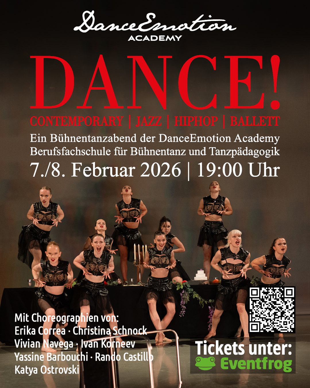 Die DanceEmotion Academy - Berufsfachschule für Bühnentanz - zeigt an ihrem Bühnentanzabend die Vielseitigkeit ihrer Ausbildung anhand stilistisch gänzlich unterschiedlicher Choreographien in Contemporary, Jazz, HipHop und Ballett.